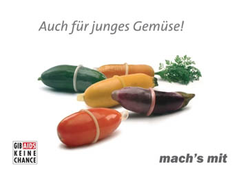 セーフティー・セックスキャンペーンは普段の街中でも見られる。コンドームを着けた野菜とか果物の大きな看板があちこちで見られる。最初はびっくりしたけど。何月ヶに一度、リニューアルされる。コンドームはお店に行かなくても買うことができる。大ていのトイレに自販機が設置してある。レストランとか飲み屋とか、素敵な出会いがありそうな場所でも、イザという時にもセーフティーに・・・・なのか?IKEAのトイレにもあったりする。そういや、おじさんのレストランには置いてなかったな。村の飲み屋だと次の場所に困るからかな。コンドームは手軽に買えるけど、使う人が少ないのかも。これぐらいダイレクトに表現しないとダメなんだろうな。